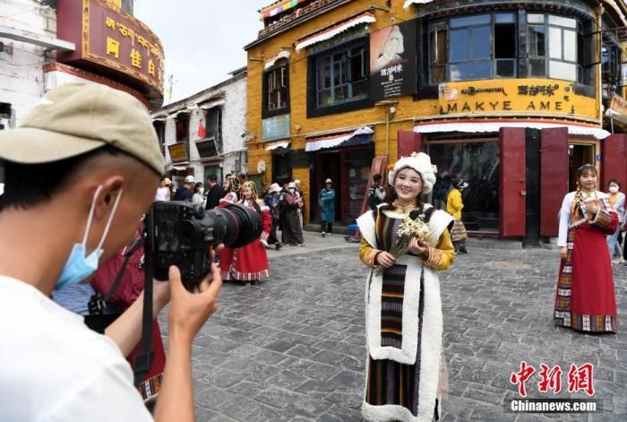 圖為7月24日,游客穿上藏族傳統(tǒng)服飾在拉薩市八廓街拍照留念。 中新社記者 貢嘎來(lái)松 攝