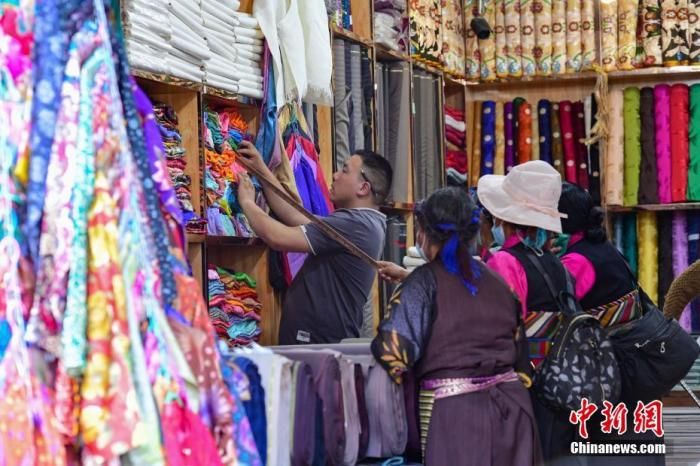 圖為7月24日,幾位藏族婦女在拉薩老城區(qū)八廓街上的藏裝店內(nèi)選購(gòu)藏裝。 中新社記者 貢嘎來(lái)松 攝