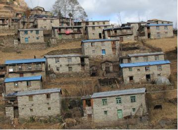 夏爾巴人的房屋建筑形式特殊,一般都是人字形頂,上蓋魚鱗板(即用斧子劈成的薄板),四周用石塊壘成厚墻,在墻上架梁造樓。其建筑大都分為三層,底層結構用石頭砌墻的較多,中層四邊是用木板層層如圍墻式地圍起來,頂層四邊留有適當?shù)目障?,以便于通風,或照射太陽。