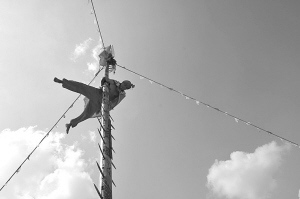 雖然符長(zhǎng)洪教了理論絕招,可是在真刀、真火面前,第一次上場(chǎng)的徒弟們還是搖頭再搖頭,扭捏不敢上。此時(shí),恰逢村里有人家邀請(qǐng)符長(zhǎng)洪去表演,他就趁機(jī)帶著徒弟一起去。表演現(xiàn)場(chǎng),符長(zhǎng)洪用布包著刀刃,要幾個(gè)徒弟爬上刀梯。徒弟們上到梯頂后,符長(zhǎng)洪卻把布條扯開(kāi),露出亮晃晃的刀刃,并在刀梯四周點(diǎn)燃火堆大喊:“下來(lái)吧!踩到刀上,走過(guò)火堆,你們就出師了!”