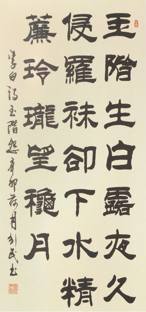 張行民的書法作品博覽眾家之長(zhǎng),悉心揣摩隸書之要義,領(lǐng)悟其精髓,加入其心志與感悟,漸漸形成了自己的風(fēng)格。他的作品灑脫飄逸,體骨厚重,參合有各派書體的筆意,同時(shí)又有自己個(gè)性和意境的張揚(yáng),字體端莊英武,體象收放凝度。賞其書法,總能給我們一種“渾然陣列,筋道玉骨”的美感,實(shí)屬不可多得。