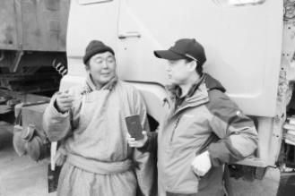 2017年,王玉龍(右)在內(nèi)蒙古二連浩特采訪蒙古國卡車司機(jī)。 受訪者供圖