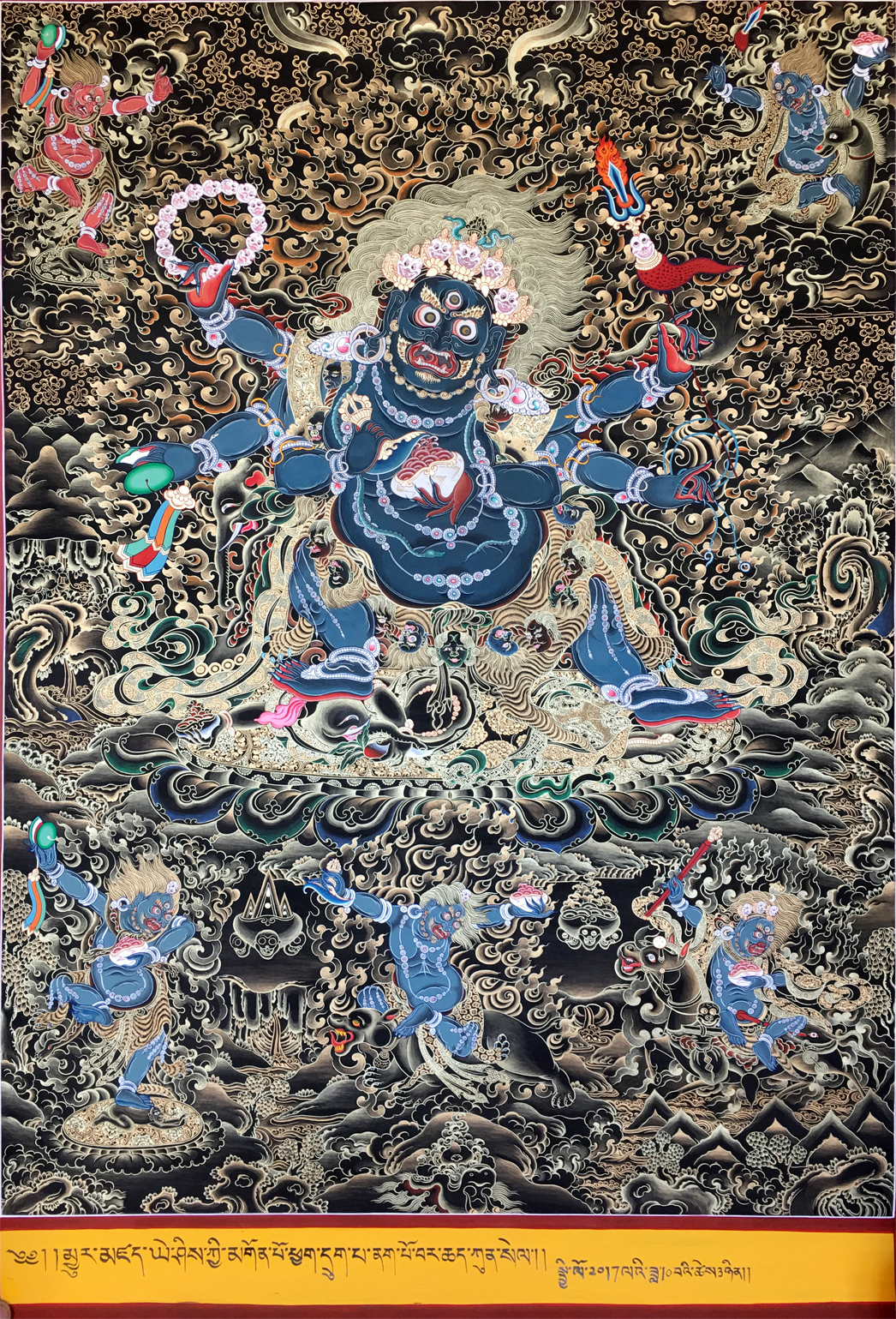 六臂瑪哈嘎拉(梵語:Mahakala,藏語:Gonpo)又意譯為大黑、大時、大黑神或大黑天神等,或者直接音譯為摩訶迦羅(佛經(jīng)中經(jīng)常出現(xiàn)的名字)、莫訶哥羅、瑪哈嘎拉等名稱。該神本是婆羅門教濕婆(梵語:Shiva,梵語又名:Mahesvara,即大自在天)的變身,后為佛教吸收而成為佛教的護法,特別是在密宗中大黑天是重要的護法神。藏傳佛教認為大黑天是毗盧遮那佛(梵語:Vairocana,藏語:nam par nang zhe,或稱為大日如來)降魔時呈現(xiàn)出的忿怒相。