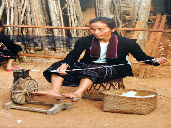 “紡”是把野生棉花或木棉花用絞棉機去除棉籽后捻成線,纏繞到手捻紡輪車上,包括錯紗、配色、綜線、攀花等。