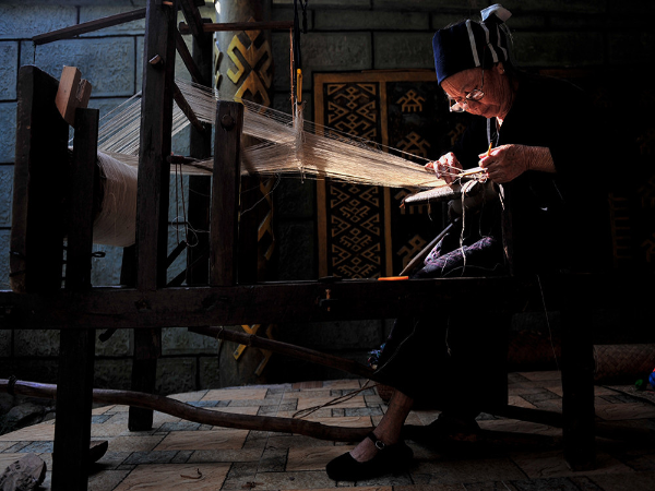 “織”是指使用踞腰織機,采用通經(jīng)斷緯的紡織方法織出各種花紋圖案,在織布時,先手工掛經(jīng),綁住藤或樹皮布腰帶,用腳踩織機的經(jīng)線木棍,席地而坐織布??椈ㄊ怯煤谏蛩{黑色做底線(經(jīng)線),根據(jù)圖案需要,將各種染色的線搭配,拉經(jīng)線、投緯線(彩色線),用木刀打緊緯線,織出各種花紋圖案。