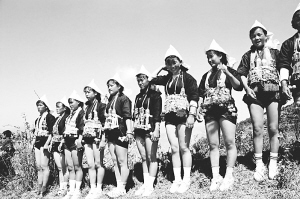 “仰阿娜節(jié)”時(shí),十村八寨的姑娘、小伙們?nèi)绯彼銋R聚到大羊街鄉(xiāng)的孟子轟都山。小伙子們懷揣定情信物,姑娘們手持小白傘,腰挎小三弦,大家又唱又跳,歡聲笑語。此時(shí),奕車姑娘裸露的美腿成為姑娘們相互嬉鬧的對象。只見她們從松樹上摘下松葉,悄悄走到伙伴跟前,往伙伴腿上一扎。被扎的姑娘“哎呦”一聲驚叫,還以為被什么蟲子咬了。小伙子要是看上中意的姑娘,就會悄悄拉著姑娘躲到松林僻靜處去訴說衷腸。