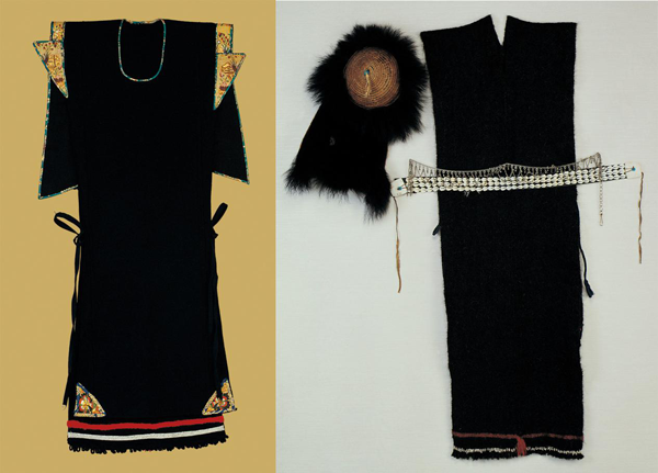 珞巴族的民族服飾已列入國家級非物質(zhì)文化遺產(chǎn)名錄。圖為珞巴族民國時期貫頭式氌氌女服與男服,中央民族大學(xué)民族博物館館藏。