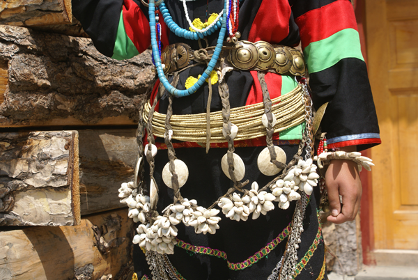 珞巴族男女都喜歡佩帶裝飾品,男子戴手鐲、竹管耳環(huán)、項鏈,腰間掛弓箭、長刀等物。婦女特別喜歡佩戴五顏六色的項珠,盛裝的婦女脖頸上有時戴十幾串到幾十串珠子,再加上手鐲、耳環(huán)、銅鈴、銀幣、鐵鏈、小刀、火鐮、海貝等飾物,有十幾斤重,可裝滿一個竹背筐,并被視為家庭財富多寡的標(biāo)志,不可缺少的嫁妝。