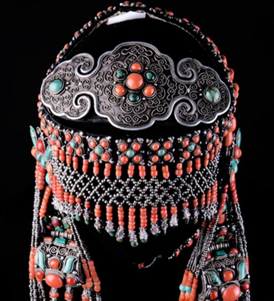額頂飾:飾在頭箍之上, 形狀近似橢圓形,前部有四塊方形銀片,上掐絲嵌綠松石和珊瑚,其中最前部掐絲鑲紅珊瑚、綠松石拼成的蝴蝶型圖案, 銀掐絲工藝為托座。從整體來(lái)看銀絲捧紅花綠葉, 十分美麗。額頂飾兩端縫于青緞?lì)^箍上, 居于整個(gè)頭飾的中心位置。