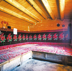 聚居新疆維吾爾自治區(qū)昌吉回族自治州奇臺(tái)縣大黑溝村農(nóng)牧區(qū)的塔塔爾族有兩種住房。一種是厚木板做墻壁的木刻楞房,另一種是平頂土房。木刻楞房建在平整的土臺(tái)上,房前設(shè)立木柱成廊道,只在前面設(shè)玻璃窗。板壁直角切半榫頭相搭,涂紅油漆。棚頂以粗大木檁密搭于板壁上,形成緩斜坡,不用椽子,直接以木板蓋頂。室內(nèi)彌漫著淡淡的松香味,以木板搭炕,中間立一細(xì)木柱,板炕上鋪花氈,被褥疊在墻角,墻邊立幾個(gè)靠墊,使坐靠更舒適。進(jìn)門正廳隔出的一小間,是方便老人起居生活的臥室。