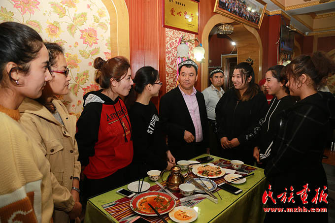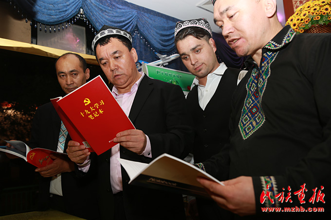 新疆美食城店主阿地力·買買提帶領(lǐng)維吾爾、哈薩克、回族等員工學(xué)習(xí)十九大報(bào)告
