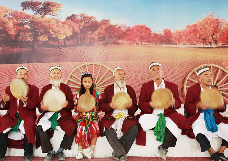 11歲的麥迪娜是小學(xué)五年級的副班長,在麥蓋提一小雙語班讀書,漢語好到可以給我做翻譯,向老藝人提問。麥迪娜的世界已經(jīng)和老藝人、和叢林中艱難漁獵的祖先不一樣了。她在麥西來甫中敲達(dá)甫手鼓,在活動中心學(xué)習(xí)電子琴,是女子“手鼓樂隊組合”中8位11—3歲女孩子中的一個。她希望將來能在北京上學(xué)、成為醫(yī)生治好奶奶的糖尿病。她會用漢語唱國歌和《歌聲與微笑》,還有《茉莉花》,雖然吐字與調(diào)子不太那么準(zhǔn)。她圍著阿布都克萊姆(被稱作“維吾爾人的趙本山”的維吾爾族諧星)索要簽名的同時,還喜歡羅志祥,以韓國偶像組合EXO為榜樣。麥迪娜還上過電視,常有喀什地區(qū)的、自治區(qū)的、全國的媒體到麥蓋提來采訪、錄制刀郎麥西來甫。