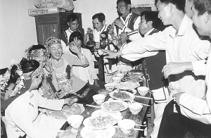 接著婚宴開始,八音隊吹奏的樂曲優(yōu)美動聽,大家喝喜酒祝賀新郎、新娘;同時,男方家的帶娘給女方家人開檳榔碗。開檳榔碗的順序是女方家人由老到小分別接檳榔碗,意在感謝女方長輩、親屬對新娘的養(yǎng)育之恩。