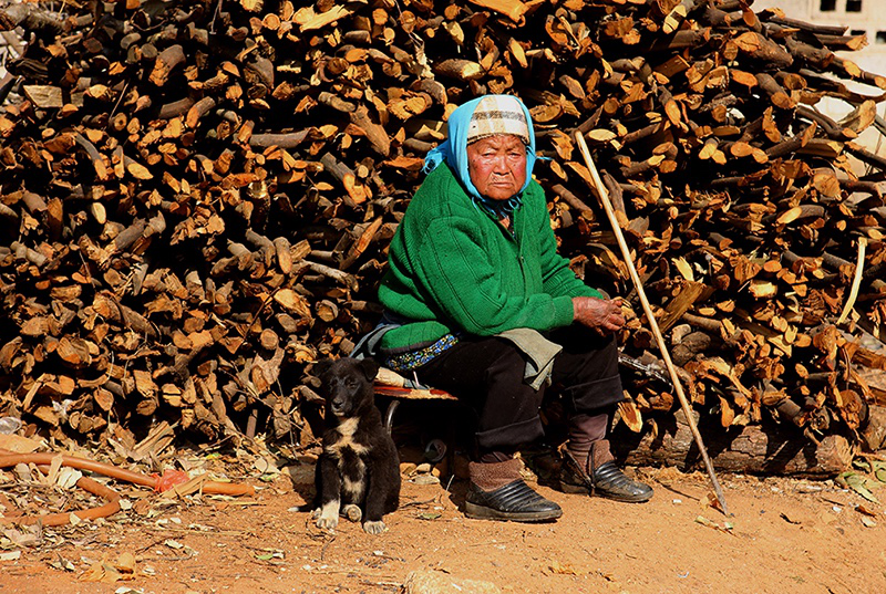2月初的丘北,連日陰雨,是一年中最冷的時(shí)節(jié)。我先于拍攝團(tuán)隊(duì)幾天到了村里,想獨(dú)自在這里轉(zhuǎn)轉(zhuǎn),熟悉一下村民,篩選一下拍攝的人物。正當(dāng)我在一個(gè)泥濘的岔路口徘徊,尋思著是否要問路去村主任家的時(shí)候,旁邊屋子里走出一個(gè)人,面容親善:“天好冷啊,進(jìn)來烤烤火吧!”他打招呼的方式如同熟人,一笑時(shí)露出兩排又白又整齊的牙齒。于是,他家擁擠的火塘邊又多了一個(gè)人。大家圍著火爐有一搭沒一搭地聊天,語調(diào)溫和小聲,沒話的時(shí)候大家也不覺得別扭,只聽見玉米骨在火塘里噼啪作響。這是一個(gè)五代同堂的大家庭,招呼我的主人楊樹紅和妻子以及祖母、父母一起生活,兒子和女兒在廣東打工,已經(jīng)回村準(zhǔn)備過節(jié),兒子未婚,女兒則有了兩歲的孩子。楊樹紅的祖母出生于1922年,是這個(gè)村子里最老的老人,耳朵有些背。我大聲問她是否還記得年輕時(shí)候踩花山,她拍著我的手背說:“17歲我就去踩花山嘎!好玩嘎!”兒媳笑著解釋說:“估計(jì)她說的是17歲踩花山的時(shí)候碰到爺爺,被他拖媳婦拖走的事呢?!弊婺改昙o(jì)太大,看著她手上和臉上深深的褶皺,不知藏了多少往事。
