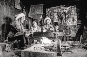 羌族婦女和兒童圍坐在火塘前。