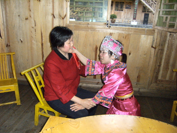 哭嫁歌內(nèi)容有“母女對(duì)哭”“嫂妹對(duì)哭”“姐妹對(duì)哭”“哭離娘席”“哭別祖宗”“哭兄弟”“哭梳頭”“罵媒人”“哭上轎”等,甚至還有同村同齡未婚姑娘的群哭——“哭十姊妹”??藜薷柙从谕良易骞媚锍黾耷暗目藜拗?,越是臨近婚期,哭聲越悲,甚至通宵達(dá)旦。2010年,“土家族哭嫁歌”已被列入第三批國家級(jí)非物質(zhì)文化遺產(chǎn)名錄。