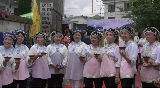 布依族青年們抬著族中神物銅鼓,吹著長(zhǎng)長(zhǎng)的號(hào)角,臉上滿是對(duì)民族節(jié)日的期待之情,驕傲又興奮;成群結(jié)隊(duì)的孩童穿著本民族傳統(tǒng)服飾,手拿錦帶,熱忱歡迎遠(yuǎn)道而來(lái)的客人;能歌善舞的布依阿姐笑臉相迎,唱著布依族的歌謠,一字排開堵在門前,客人們想要進(jìn)去參加這次盛會(huì),就得過三關(guān),干了三碗攔路酒。
