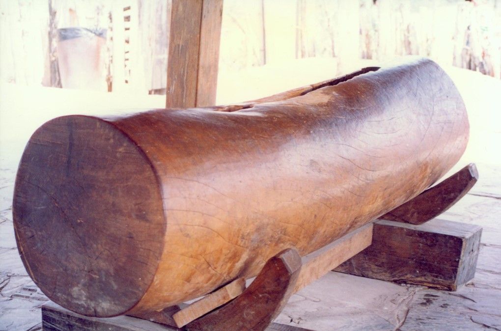 過去,佤族凡新建一個(gè)村寨,就要先找水源定寨址,再拉木鼓蓋木鼓房。佤族認(rèn)為木鼓是天神莫偉的床,木鼓房是莫偉的家,只有拉了木鼓,請(qǐng)莫偉天神進(jìn)寨保佑、才能建房立寨,拉木鼓的日子一般在佤歷一月,即公歷10月進(jìn)行。是時(shí),先由寨子派出有經(jīng)驗(yàn)的老人3—5人進(jìn)山選擇樹木,將選定的樹木每棵劈一點(diǎn)樹皮回來,由魔巴殺雞卜卦,哪棵的卦好就確定為做木鼓的樹,而后由魔巴率領(lǐng)青壯年男子進(jìn)山將樹砍倒,斷出一截做木鼓用。全寨男女老少盛裝艷服將木頭拉回,鑿成木鼓,安放于鼓房內(nèi)。拉木鼓的場面極為熱鬧壯觀,人們以能摸一下拉木鼓的繩索為最大的榮耀。木頭拉到寨外要舉行隆重的剽牛祭神儀式才能將木頭拉進(jìn)寨內(nèi)。木鼓有公母之分,公木鼓用紅毛樹,母木鼓用麻公樹。鼓長1.5-2米,鼓身直徑70—100厘米,一般是扁形和方形。洞深40-50厘米,洞口寬4-5厘米,長1.2-1.4米。洞呈瓜瓢形。背端多有牛頭形浮雕。由于所用本質(zhì)不同,公木鼓發(fā)音高亢清亮,母木鼓沉渾悠揚(yáng),響聲遙遠(yuǎn)。過去,只有逢村寨大事或械斗或集會(huì)議事,或祭祀鬼神,或告急友鄰才能敲響木鼓,平時(shí)是不能隨便敲的。由于佤族歷史上有獵人頭祭祀木鼓的習(xí)俗,村寨部落間經(jīng)常發(fā)生血族復(fù)仇的械斗。隨著獵頭陋習(xí)的革除,木鼓已從原始祟拜的氛圍中擺脫出來,成了人們喜愛的敲擊樂器,佤族編創(chuàng)了自娛自樂的木鼓舞。