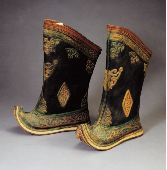 蒙古人愛穿靴子,蒙古靴分布靴和皮靴兩種。布靴多用厚布或帆布制成,穿起來柔軟、輕便。皮靴多用牛皮、馬皮或驢皮制成,結實耐用,防水抗寒性能好。其式樣大體分靴尖上卷、半卷和平底不卷的三種,分別適宜在沙漠、干旱草原和濕潤草原上行走。蒙古靴做工精細考究,靴幫、靴靿上多繡制或剪貼有精美的花紋圖案。