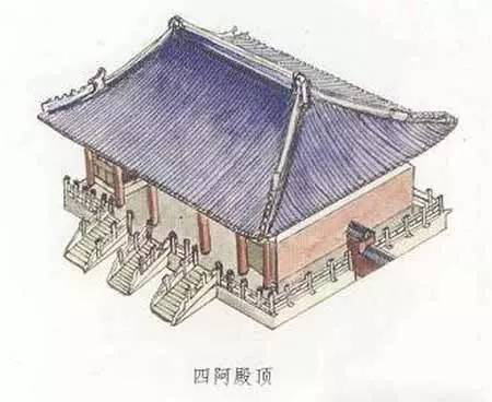四阿殿頂也就是廡殿頂。四阿殿頂也是宋式叫法。“阿”是建筑屋頂?shù)那埽八陌ⅰ本褪撬拿嫫率降那芪蓓?。廡殿頂共有五條脊、四面坡,所以叫做四阿殿頂。
