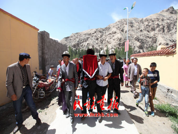 烏爾都隆窩孜村離鄉(xiāng)政府不遠(yuǎn),到達這里時,兩排土黃色的牧民新居與遠(yuǎn)處的昆侖山已經(jīng)讓我們感受到濃濃的別樣風(fēng)情。其中一戶門前人頭攢動,聚滿了很多人。不用說,這里就是舉辦婚禮人家的住處。