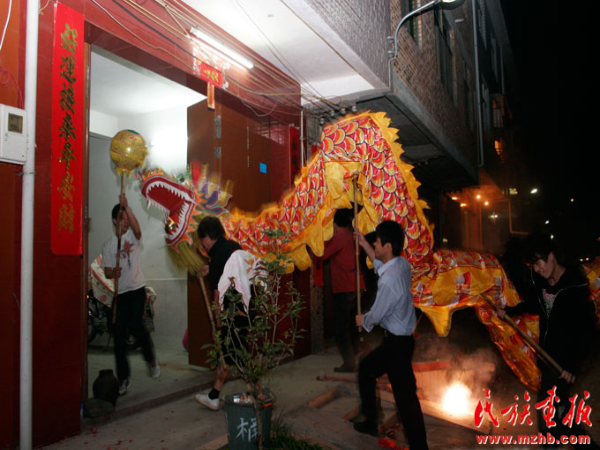 鼓聲起,鑼鼓響,鞭炮鳴。一片歡呼聲中,“龍”忽上忽下,左搖右擺地從承啟樓游出。由于五云樓是幾座土樓中最老的一座,里面還供奉著江集成及其夫人的塑像,所以拜訪從那里開始。進(jìn)入五云樓,“龍”首先來到中堂,三鞠躬,敬拜祖先和觀音。然后,“龍”開始去樓里每戶家里拜訪,各家紛紛燃放鞭炮迎接龍的到來。從五云樓出來后,“龍”前往保生大帝廟參拜諸神。據(jù)記者觀察,只要途中路過寺廟佛堂和樹神所在地,“龍”都會去參拜。