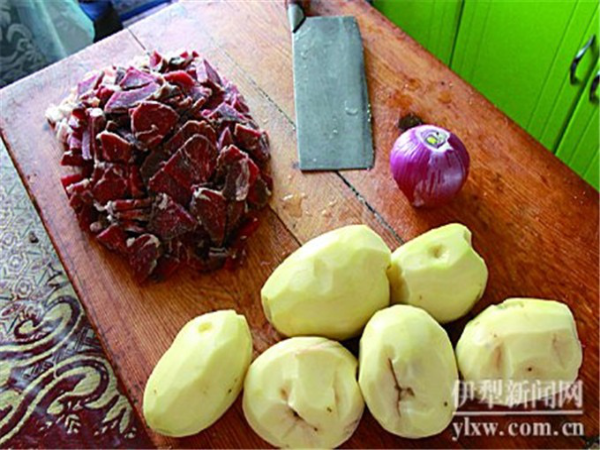 拜列西的做法有很多種,其中以用羊肉、洋蔥、土豆或南瓜為主要食材的伊提拜列西(肉拜列西)和以蘋(píng)果為食材的阿勒瑪拜列西(蘋(píng)果拜列西)為主。羊肉切薄片,土豆切小方塊,洋蔥切丁,倒在一起,擱置一旁,開(kāi)始和面。和面是制作拜列西過(guò)程中一項(xiàng)至關(guān)重要的環(huán)節(jié),面和得好壞直接會(huì)影響到烤出來(lái)的拜列西的美觀程度和口感的酥脆程度。