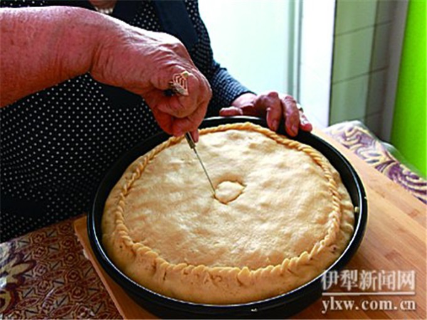這段時(shí)間,就可以拌餡了。買(mǎi)斯胡旦向先前放在一旁的羊肉、土豆和洋蔥中加入一些鹽和黑胡椒粉,攪拌均勻。肉與黑胡椒粉相融的辛辣香味已經(jīng)開(kāi)始漫溢。接著繼續(xù)揉面。將醒好的面分成大小兩塊。大的做底,小的做頂。待大小兩塊面都搟成圓形薄餅狀后,就將底子鋪在托盤(pán)底部,多出的部分緊緊扣合托盤(pán)邊緣。然后倒入餡料,鋪平,加蓋,將上下兩層面餅悉心捏合成好看的花邊。最后,在面餅中間掏個(gè)洞,切下的面團(tuán)做成小壺蓋,再原位放到上面。壺蓋的作用在于等面餅烤至表層泛紅時(shí),將其端出,取下壺蓋,加些許開(kāi)水進(jìn)去?!鞍萘形骱芎?,里面的料很多,要是水干了,就不容易熟?!辟I(mǎi)斯胡旦解釋。做完這一切,就可以將托盤(pán)放進(jìn)烤箱了,調(diào)整烤箱至200℃的火力就夠,這樣,經(jīng)過(guò)2個(gè)小時(shí)的烘烤,外酥內(nèi)軟,香而不焦的拜列西就烤好了。