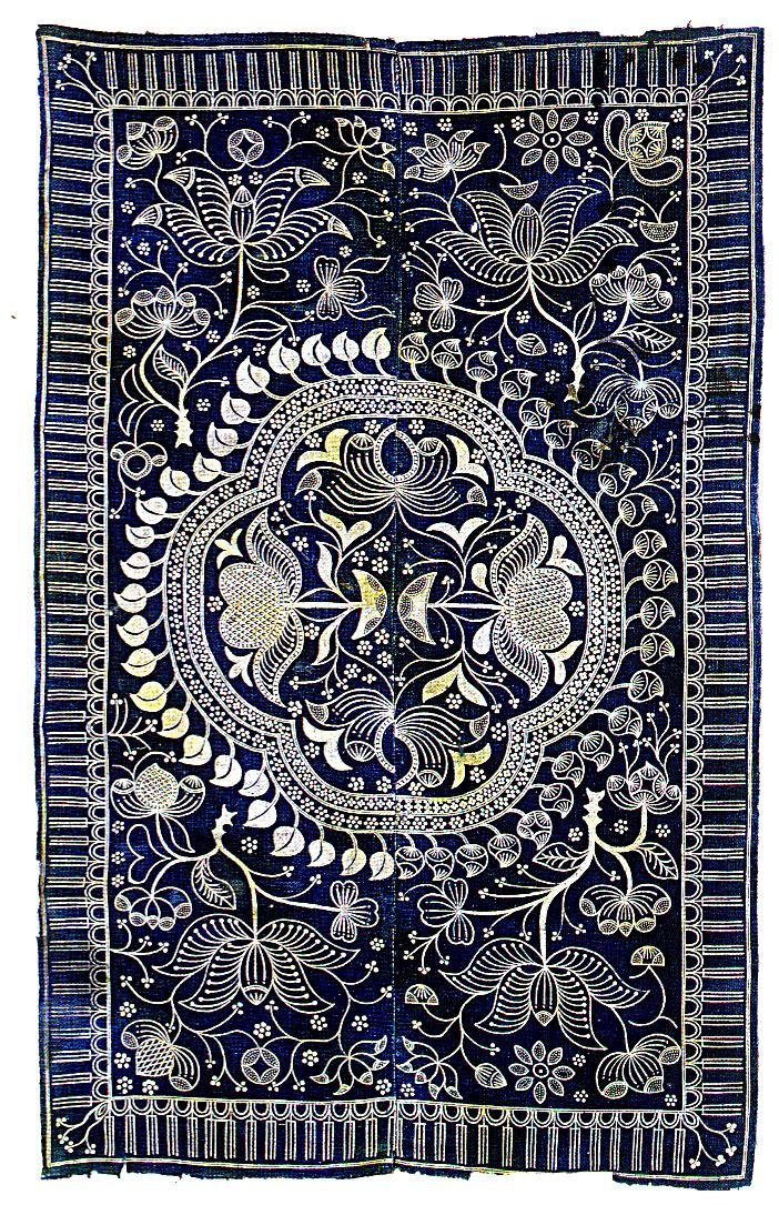 苗族蠟染歷史悠久,很多地方都流行有《蠟染歌》(古歌),敘述蠟染的起源。早在秦漢時代,苗族的先民就已經(jīng)掌握了蠟染技術(shù),據(jù)《貴州通志》記載:“用蠟繪花于布而染之,既去蠟,則花紋如繪”,這種蠟染布曾被稱為“闌干斑布”。宋代五溪地區(qū)的“點蠟幔”(蠟染)已很盛行。明、清時代,黔中一帶苗族也多用蠟染衣料。民國年間,蠟染盛行于湘西、貴州、云南、川南的大部分苗族中,而以貴州的丹寨、安順、郎岱(今六枝)、普定、惠水等地技藝最高。大多數(shù)地區(qū)都將蠟染成品作衣飾,湘西地區(qū)則用作床單、枕巾等。