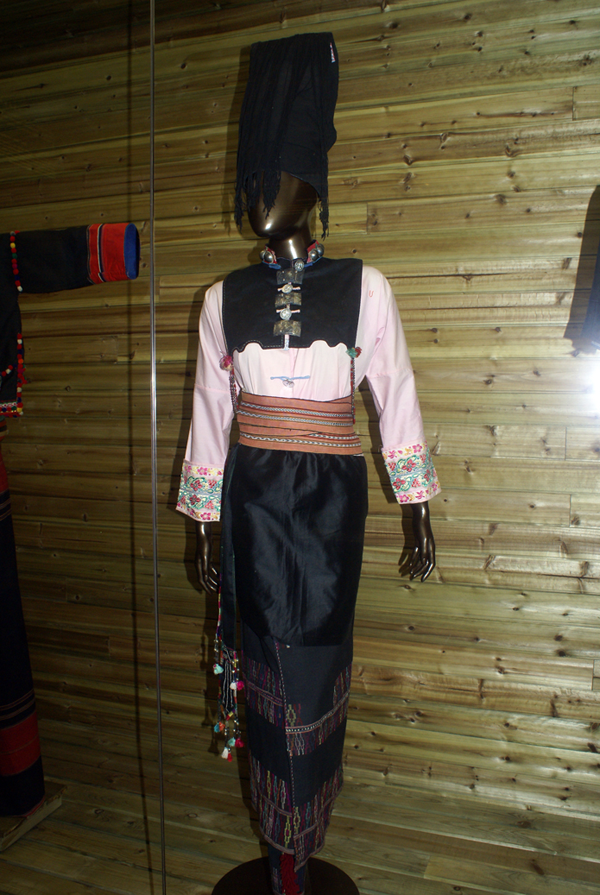 男子穿對襟上衣,下著黑褲,斜背“筒帕”,喜歡在胸前戴朵紅絲線結(jié)成的菊花。未婚男子戴白包頭,已婚男子戴藏青色包頭,青壯年在腦后留一尺多長的包布,有隨身佩帶刀的習俗,其中“戶撒刀”最為有名。