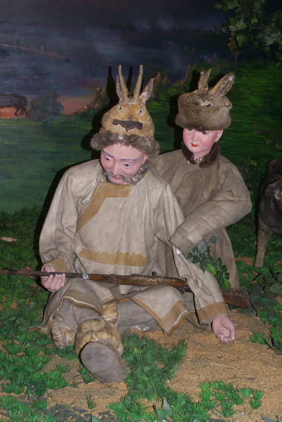 狩獵經(jīng)濟在鄂倫春族社會中維持了幾千年,一人一匹獵馬一桿槍,再加上幾條獵狗和一片獵場,幾乎就是鄂倫春族的全部生產(chǎn)力。而槍支的傳入也不過才300多年的歷史,在此之前使用石塊和木棒狩獵,后來發(fā)明了扎槍和弓箭,與外界幾乎隔絕,純粹的食獸肉、衣獸皮。鄂倫春族最早使用的獵槍是被稱做“俄羅斯鳥槍”的火槍,這是清朝的察邊官吏、外民族及俄國商人交換給他們的。有火繩槍、火鐮槍和泡子槍三種,都是從槍筒裝入火藥或鉛彈,只是引爆方式不同。民國以后陸續(xù)傳入俄國造的連珠式和“三八”式、“七九”式等現(xiàn)代步槍。槍支的傳入,使鄂倫春人有了剩余產(chǎn)品,于是出現(xiàn)了交換經(jīng)濟。每年五月的“楚勒罕”集會時,鄂倫春、鄂溫克、達斡爾等狩獵民族要向清廷貢貂,經(jīng)朝廷官員檢驗,不合格者可以在集會上進行互市。此時,他們也帶一些其他的獵產(chǎn)品及手工藝品進行交換。由于鄂倫春人所貢貂皮質(zhì)量最好,故朝廷對他們采取了特別的納貂辦法:每年派一名專職人員到鄂倫春地區(qū)代表官府征收貂皮、發(fā)放賞賜。這些專職人員被稱為“諳達”,他們代表官府征收貂皮的同時,也自帶一些糧食、布匹和其他生產(chǎn)、生活用品與鄂倫春人進行私下交換。后來,“諳達”變成了泛指進山進行獵產(chǎn)品收購生意的所有商人。“諳達”與鄂倫春人進行交換時從不計價,而是以“馬馱”為計量單位,雙方以同樣一馬馱的物品進行互換,或者采取包干制的辦法,一個“諳達”固定幾個包攬戶,按期供給他們生產(chǎn)和生活必需品,包攬戶將所有的剩余產(chǎn)品交于“諳達”。隨著貨幣經(jīng)濟的發(fā)展,清末時期,鄂倫春族周邊地區(qū)出現(xiàn)了眾多商號商鋪,這些商號(鋪)的老板被稱為“老客”,他們同鄂倫春人進行計價交換。同時還出現(xiàn)了一些進行計價交換的行商,被稱為“跑老客”。鄂倫春人雖然受到“諳達”、老客和跑老客的瘋狂欺詐和層層盤剝,但在與他們的交換中,卻自覺或不自覺地打開了封閉的自然經(jīng)濟大門,朝著商品經(jīng)濟邁進了一步(鄂倫春博物館展覽攝影:劉軍)。