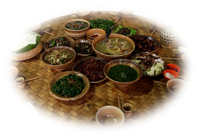 德昂族絕大多數(shù)以大米為主食,部分地區(qū)雜以包谷和薯類(lèi)。均以蒸燜而食,擅長(zhǎng)制作各種糧食制品,如:豌豆粉、豆腐、米粉、年糕、粑粑、湯圓等。蔬菜種類(lèi)繁多,竹筍是四季不斷的蔬菜之一,除鮮吃外,多加工成酸筍或干筍食用。其他蔬菜的食用,都習(xí)慣于在煮燉時(shí)配酸筍,或加油、豆豉、鹽成雜熬菜。酸筍用途十分廣泛,即使在燉雞、炒肉或烹魚(yú)時(shí)都要加酸筍調(diào)味。受當(dāng)?shù)貪h族的影響,許多漢族風(fēng)味的腌菜、腐鹵也是德昂族餐桌上常見(jiàn)的小菜。德昂族民間制陶和使用竹編制品歷史悠久,所有炊餐用具,大都是自制的陶器和竹器。