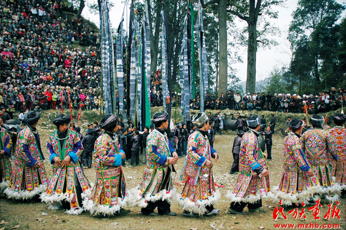 苗族春節(jié)是以農(nóng)歷正月初一為歲首的漢族和其他少數(shù)民族共同歡度的傳統(tǒng)節(jié)日。在黔東南的苗族,把春節(jié)叫做“漢年”(niangxdiel)與傳統(tǒng)的“苗年”(niangxhmub)并存,和其他民族一共同歡度,尤其是那些不過苗年的苗族地區(qū),主要是過春節(jié),但不及苗族過苗年隆重,識(shí)漢字的苗族也貼些對(duì)聯(lián)、門神之類,其余與過苗年相同,即增加了斗牛、賽馬、走親訪友以及男女青年“游方”、對(duì)歌等民族特色的內(nèi)容。有的人家的男婚女嫁也選在春節(jié)舉行。湘西地區(qū)的苗族過春節(jié),還舉行規(guī)模盛大的“趕牛場(chǎng)”活動(dòng);廣西融水縣一帶的苗族過春節(jié),舉行蘆笙舞會(huì),每年群眾竟達(dá)數(shù)萬人之多。