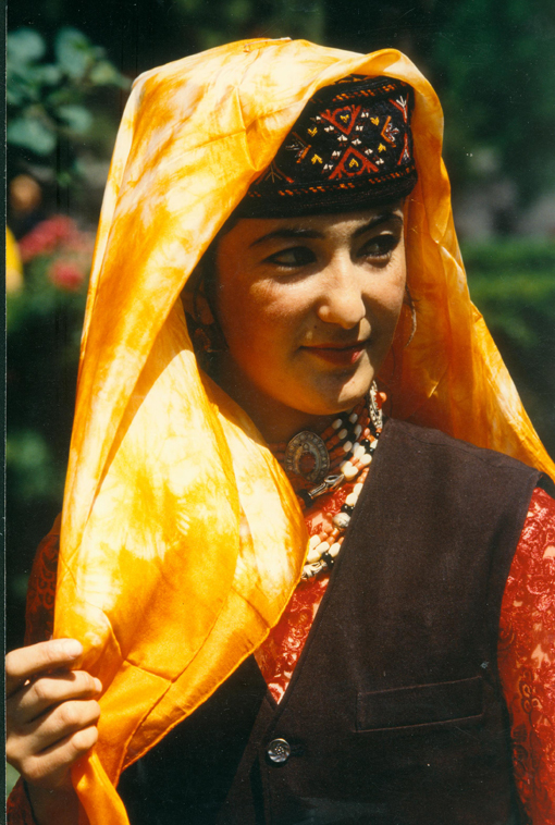 塔吉克族的服飾以帽子最具特色,男子一般戴黑絨、圓形、高統(tǒng)帽。女子一般戴帶圓頂、繡花棉帽,帽子的后半部垂有后簾,出門(mén)時(shí),帽子外可以加披方頭巾,一般多為白色,新娘通常會(huì)選擇紅色,小姑娘有時(shí)候用黃色。