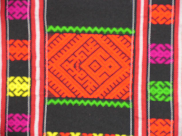 黎錦花紋圖案豐富多彩,多達百余種。較有代表性的圖案有人物類圖案、動物類圖案、植物類圖案、天體類圖案、器物類圖案、文字類圖案。其中,“人物類圖案”是黎錦的基本核心、中心圖案,它在各種織錦中永遠居于中心位置,形成中心紋飾,其他圖案可根據(jù)需要,或放在它的周邊,或放在它的第三、第四等位上。人物類圖案有單個的,也有多個組合的,有全身的,也有半身和頭像的;同時也有復合圖的。復合圖像上,有三重人物圖像嵌套,大套中,中套小,形成復合效果,構(gòu)圖復雜,工藝精湛。人物類圖案即祖先紋或鬼紋,黎族民間管這類紋樣叫做“剖”、“登”,即“祖先”或“鬼”的意思。黎錦中的人物紋樣的定位,反映了黎族人的濃厚的祖先崇拜意識。