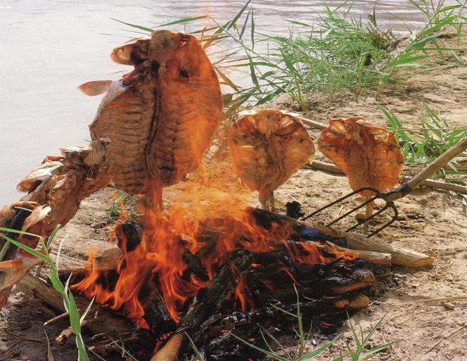 赫哲族居住的三江流域,河流縱橫交錯,群山環(huán)繞,蘊藏著極為豐富的漁獵資源。長期以漁獵為生的赫哲族人民,在征服自然、改造自然的歷史發(fā)展過程中形成了具有濃郁民族特色和地域特色的傳統(tǒng)飲食文化。其傳統(tǒng)飲食以漁獵產(chǎn)品為主,魚干獸肉,家家堆積為糧。這與農(nóng)牧民族相比,別具特色。