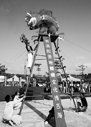 獅子過(guò)天橋、刀尖獅技、高樁飛獅……一只只威風(fēng)凜凜的“獅子”在高臺(tái)或梅花樁上騰挪跳躍,它們時(shí)而回首擺尾,時(shí)而單腿直立,時(shí)而臥居山川,時(shí)而沖向九霄,甚至還會(huì)沖觀眾眨眼吐舌,憨態(tài)可掬,惟妙惟肖。整個(gè)場(chǎng)面既驚險(xiǎn)又有趣,讓大批駐足觀看的游客大開(kāi)眼界……