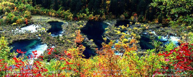 九寨溝四周群山聳峙,有雪峰數(shù)十座,高插云霄,終年白雪皚皚。河谷地帶奇水薈萃,其間有成梯形分布的大小湖泊114個(gè),瀑布群17個(gè),鈣華灘流5處,泉水47眼,湍流11段,以1870米的海撥高差,在12 座雪峰之間穿林跨谷,珠連玉接,呈Y字型串珠,逶迤近60公里,形成了中國(guó)唯一、世界罕見(jiàn)的以高山湖泊群和瀑布群以及鈣華灘流為主體的風(fēng)景名勝區(qū)。湖泊小者數(shù)平方米,最大的長(zhǎng)海長(zhǎng)達(dá)7公里。湖水終年碧藍(lán)澄澈,色彩斑讕,在陽(yáng)光照射下,呈現(xiàn)出藍(lán)、黃、橙、綠等多種色彩,絢麗奪目。天氣晴朗時(shí),藍(lán)天、白云、雪山、森林倒映湖中,水光浮翠,美麗如畫(huà),并隨季節(jié)推移呈現(xiàn)出不同的色彩和風(fēng)韻,有“九寨歸來(lái)不看水”之說(shuō)。