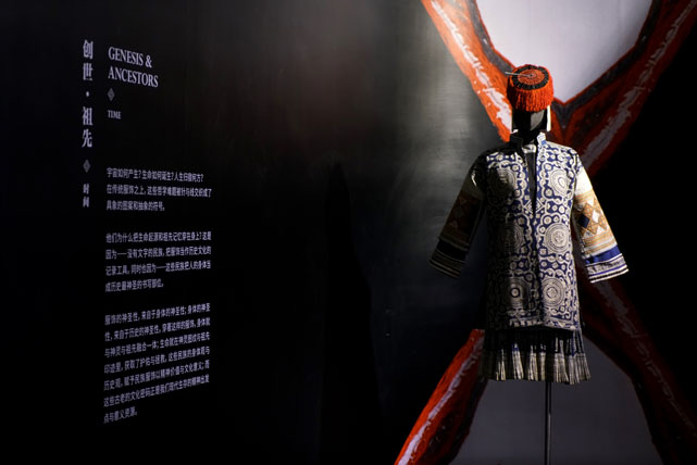 展覽呈現(xiàn)了在傳統(tǒng)服飾中,這些哲學(xué)難題被針與線在不同歷史時(shí)期交織成具象圖案和抽象符號(hào)——對(duì)于創(chuàng)世與祖先,對(duì)于人與神、天與地,傳統(tǒng)服飾成為苗、瑤、彝、侗等民族書寫與描摹的材料;服飾之上精美的紋飾,展現(xiàn)出這些民族心中神靈的形象,勾畫出民族英雄的事跡,從而建立起關(guān)于自我認(rèn)識(shí)的圖景,生發(fā)出對(duì)宇宙的敬畏。