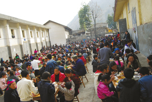 每年秋收后到翌年播種前,是四川涼山金陽縣人結(jié)婚的黃金季節(jié)。無論是在縣城還是農(nóng)村,不管是吃“九斗碗”,還是吃“坨坨肉”,大家都喜歡擺壩壩宴。在金陽縣城,常??梢钥吹竭@樣一幅景象:數(shù)百人聚在一處,圍坐于一張張方桌旁,伸箸暢食,舉杯暢飲。一盆盆肉端上桌子,主人不停地招呼客人趁熱吃。