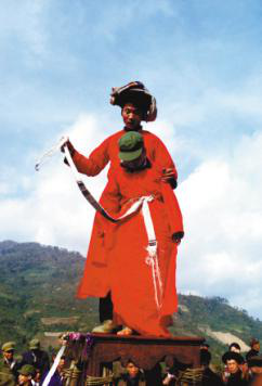受戒儀式前前后后要舉行好幾天,一般依照受戒者家的經(jīng)濟條件來定。時間短的叫“小辦”,時間長的稱“大辦”。但其中有一條,不論時間長短,度戒中的規(guī)矩是不能違背的。這次十幾位受戒者合起來辦的度戒,聽說是七天七夜的“大辦”。在這幾天中,受戒者必須嚴(yán)禁會客、社交、唱歌等,只能低頭修身養(yǎng)性,吃清淡無油的飯和水。度戒中最重要的一件事是聘請師父,有“度師”和“度道”之分,師傅自然有“師公”和“道公” 之分。師宗縣藍靛瑤中的度師為武戒,師公要負責(zé)“五臺” 受戒儀式。度道為文戒,道公身穿紅色法衣,負責(zé)念經(jīng)求神等儀式。受戒祭師一般由德高望重的長者擔(dān)任,他們是寨中一切主要事務(wù)的決策者,也是寨中最有學(xué)問的人。在受戒儀式中,他們要對弟子進行族史、族規(guī)、社會道德等多方面的教育。