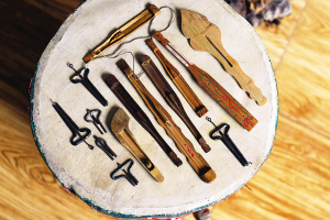 安宇歌介紹,口弦都是純手工制作的,最難制作的部分是能發(fā)音的中簧。制作中簧時,選取原料須是圓形鋼絲,先要將其砸扁,兩邊是尖的,整個簧的距離由寬到窄,窄的部位向上折彎成鉤,留兩公分長度,再折一小鉤。并且,中簧需高溫淬火,這是一個難度極高的環(huán)節(jié),全憑手感。如簧不淬火便會彈性不好,淬過了頭則一彈就碎,淬不到位會導致彈撥口弦時所發(fā)的聲音不佳。從某種程度上講,用口弦彈奏的音樂之所以引人側耳,關鍵就在這根中簧上。