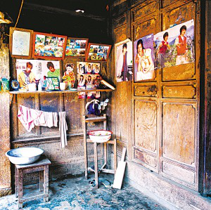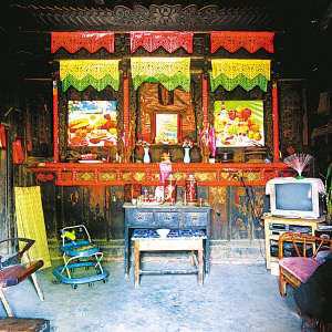 隴川縣戶撒鄉(xiāng)曼旦寨是阿昌族古老的村寨之一,明、清時(shí)期的老宅皆以楠木建造,數(shù)百年不朽、無(wú)蟲(chóng)蛀。受漢族文化影響,傳統(tǒng)民居大都是土木石結(jié)構(gòu)的三合一照壁或四合院落。正房建在長(zhǎng)方石條加土方壘起的屋基上,屋基下為院壩,以三層石階上下。正房三開(kāi)間,四排五柱,中柱起脊,形成雙斜面屋頂,上覆凹型青瓦。后墻和兩側(cè)山墻以土坯砌筑,外面不抹泥,左右是廂房或照壁。室內(nèi)隔墻均為木板,中間一間為堂屋,有一米多寬的吞口,六扇雕刻的木板門(mén),平時(shí)只開(kāi)中間兩扇。兩邊的檐柱頭有粗獷的木雕。吞口有走廊的作用,一般左側(cè)角設(shè)臉盆架以供洗漱,板壁上掛小鏡框以便梳妝,旁邊掛著家人的照片。有的擺著縫紉機(jī),有的放藤椅小憩。右側(cè)放臨時(shí)的農(nóng)具,掛衣服,板壁上貼著影視明星的招貼畫(huà)。堂屋正面板壁是通高的木雕佛龕,供奉佛像和傣文的經(jīng)文,龕楣上貼著三至四層掛錢(qián),下面有燭臺(tái)、香爐。左側(cè)擺著電視機(jī)、熱水瓶、茶桌,板壁上掛著戶撒刀和手工編織的背兜,右側(cè)有專供老人休息的床或藤椅,也有的砌火塘,火塘的小土臺(tái)上放著炒菜的調(diào)料、火柴和照明燈具。