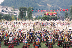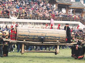 今年適逢雷山縣多個(gè)村寨過(guò)13年一次的鼓藏節(jié),2000余名苗族同胞在開(kāi)幕式上再現(xiàn)了古老神秘的祭鼓儀式。鼓藏節(jié)也是緬懷先人、祭祀祖宗的古老節(jié)日,過(guò)節(jié)期間,家家宰豬祭祖,走親訪友,舉行跳蘆笙舞、斗牛等民間傳統(tǒng)活動(dòng)。