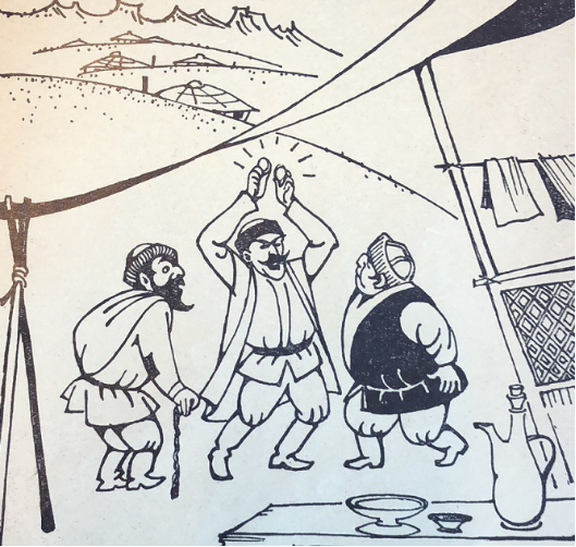 有一天,霍加納斯?fàn)栐诼飞仙⒉?,?tīng)見(jiàn)路旁飯館里鬧哄哄的。他好奇地走進(jìn)去一看,肥胖的掌柜正在打一個(gè)窮漢,窮漢的衣服都被撕破了,可是兇狠的胖掌柜還是邊打邊罵。