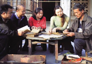 布依儺書先生(右)向考察人員講解布依族文字
