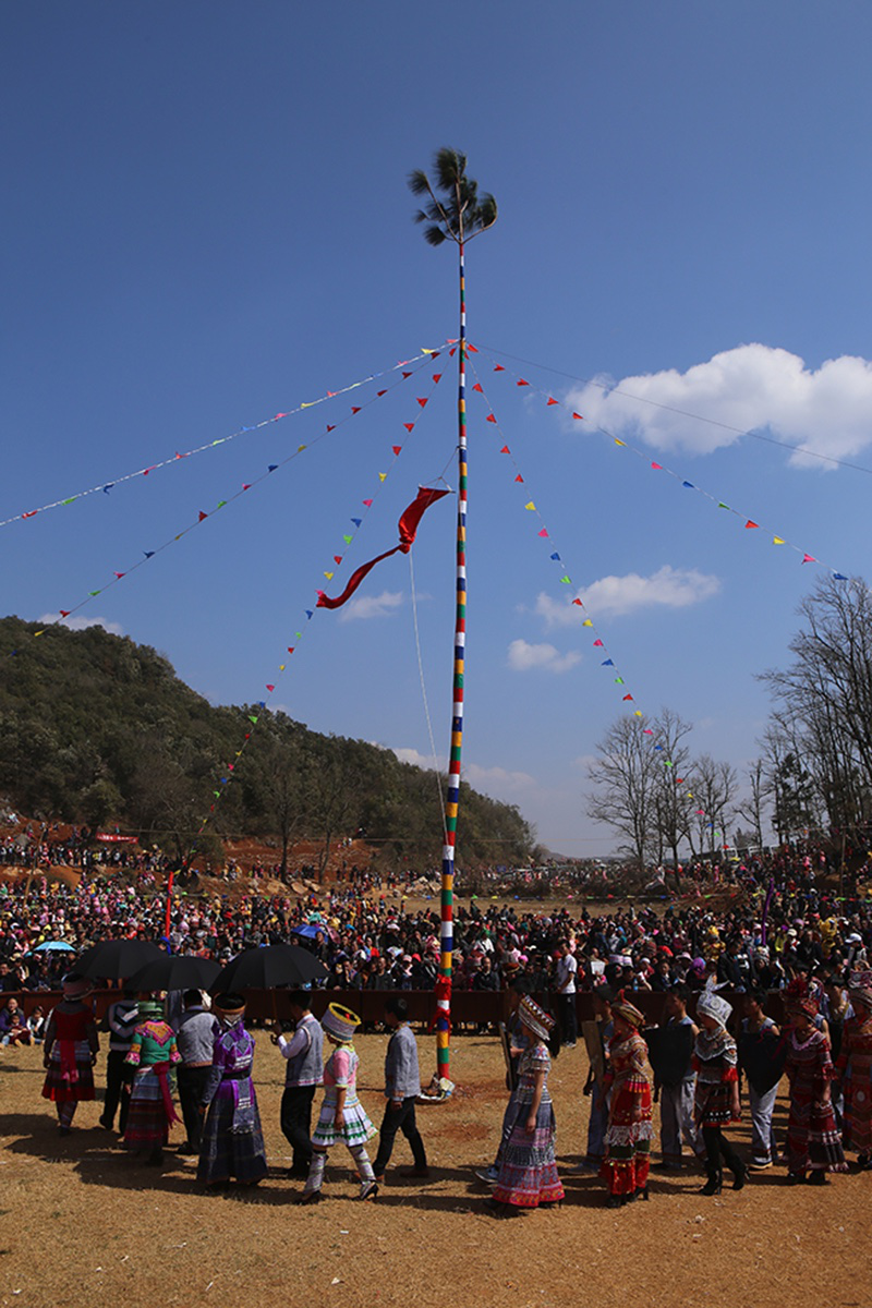女人傘下唱著:“漢人過(guò)年漢人出山,苗族過(guò)年燒香焚紙祭花桿;漢人過(guò)年漢人燒火地,苗族過(guò)年全都到花桿前相聚。哎—,小帥哥呃,小帥哥,花桿就樹(shù)在那山坡?!?/p>