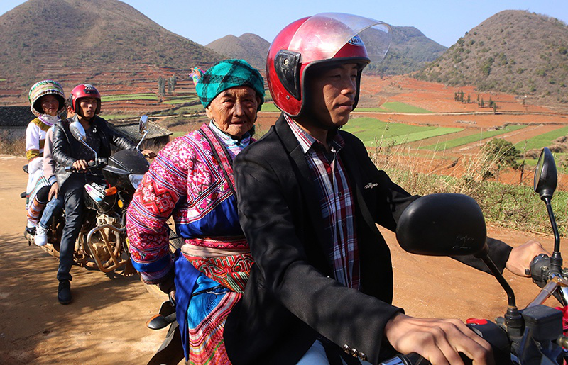 依布底一起去踩花山的人組成長(zhǎng)長(zhǎng)的摩托車(chē)隊(duì),老阿婆腰桿筆挺盛裝坐在摩托車(chē)后座上。等他們來(lái)到大布紅村的花山場(chǎng)時(shí),那里早已人山人海,空地上山坡上也擠滿了衣著鮮艷的人群。