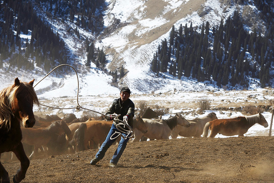 我首先到訪的是達(dá)楞達(dá)坂一帶。接待我的主人卡瑪儀表堂堂,60多歲還在照料自家的畜群。老人沒有興趣放羊,每天吆著100多匹馬和300頭牦牛在日月間往復(fù)。一望無際的雪原,把暴烈的馬群和野性難馴的牦牛吆往一個地方或再吆回去,騎馬的強(qiáng)度與奔跑的頻率遠(yuǎn)不是他這個年紀(jì)的人所能駕馭的了。但老人不這么想,他不愿意在和靜縣城的暖氣房子里喝茶陪孫子們,而更愿意在他的馬背上,每天奔波在雪原上。