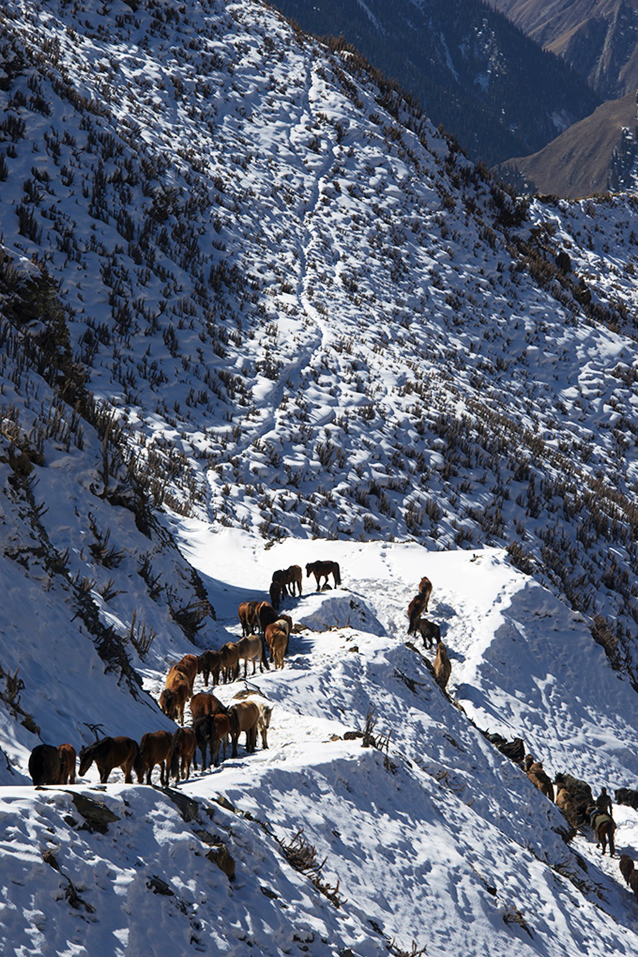 在數(shù)次轉(zhuǎn)場(chǎng)中,去往冬牧場(chǎng)最為艱苦。10月的巴音布魯克,臨近天山的多變氣候常會(huì)帶來(lái)大雪。春牧場(chǎng)的豪華氈包不適用,駐扎或轉(zhuǎn)場(chǎng)使用的多是僅有十幾根棍支撐的“角洛姆”。就簡(jiǎn)易和實(shí)用的雙重價(jià)值而言,“角洛姆”堪比印第安人的帳篷和哈薩克族人的單人野宿帳篷。不過(guò)我相信,“角洛姆”的歷史一定早于蒙古包。見(jiàn)到它,蒙古人數(shù)千年的飄泊歲月一下連通。正是“角洛姆”的庇護(hù),才使得當(dāng)年的蒙古大軍馳騁歐亞大陸少了一份累贅,亦如我隨著彭才一家往冬牧場(chǎng)的轉(zhuǎn)場(chǎng),白天把“角洛姆”綁在駝垛子上,晚上支架起來(lái)就是一個(gè)家。轉(zhuǎn)場(chǎng)第二天,馱運(yùn)“角洛姆”和一應(yīng)家什的駱駝、牦牛翻越海拔3000米之上的恰布恰勒達(dá)坂前往冬牧場(chǎng)。這條路最大的好處是寬,不至于把捆在駱駝或牦牛身上的垛子撞翻。羊群、馬群和不馱東西的牦牛走特克斯河牧道,路程短一半,只是行走難度大。一條羊腸道,時(shí)常就在崖壁之下通過(guò),一地碎石滾落,數(shù)十米之下就是咆哮的特克斯河。牧道最窄的地方,容不得兩匹馬錯(cuò)過(guò)——這是巴音布魯克草原最為驚心動(dòng)魄的冬季轉(zhuǎn)場(chǎng)牧道。